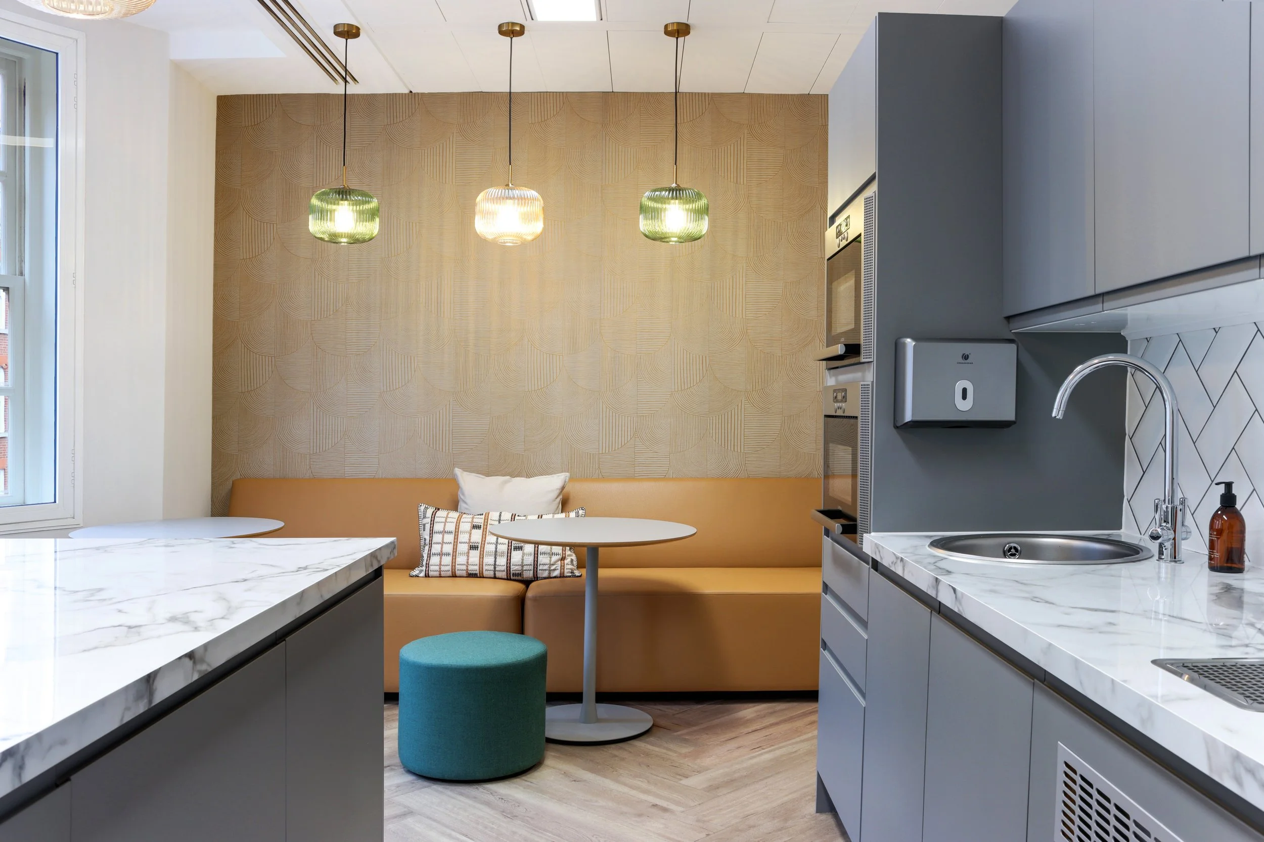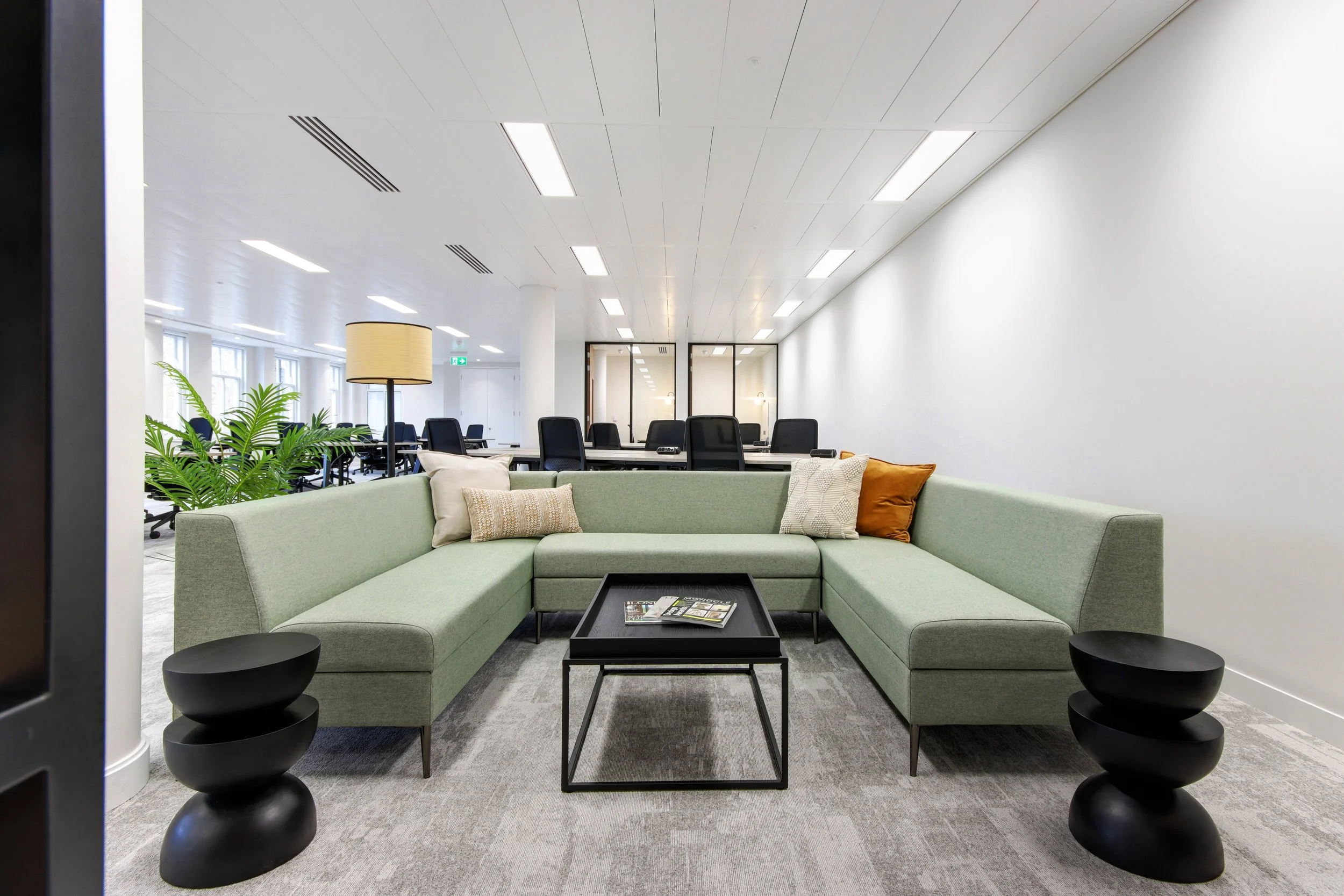 The inherited layout, once home to a merchant bank, reflected a pre-COVID approach to workspace design. Flexibility and mixed-use areas were key to the brief, so we introduced angled desking to fill the usable space, which can also be adapted later to increase desk numbers if needed. Office space and meeting rooms were divided and reconfigured for modern-day practicality, whilst the kitchen and breakout areas were upgraded to be warm and welcoming with improved lighting, finishes and comfortable furnishings.